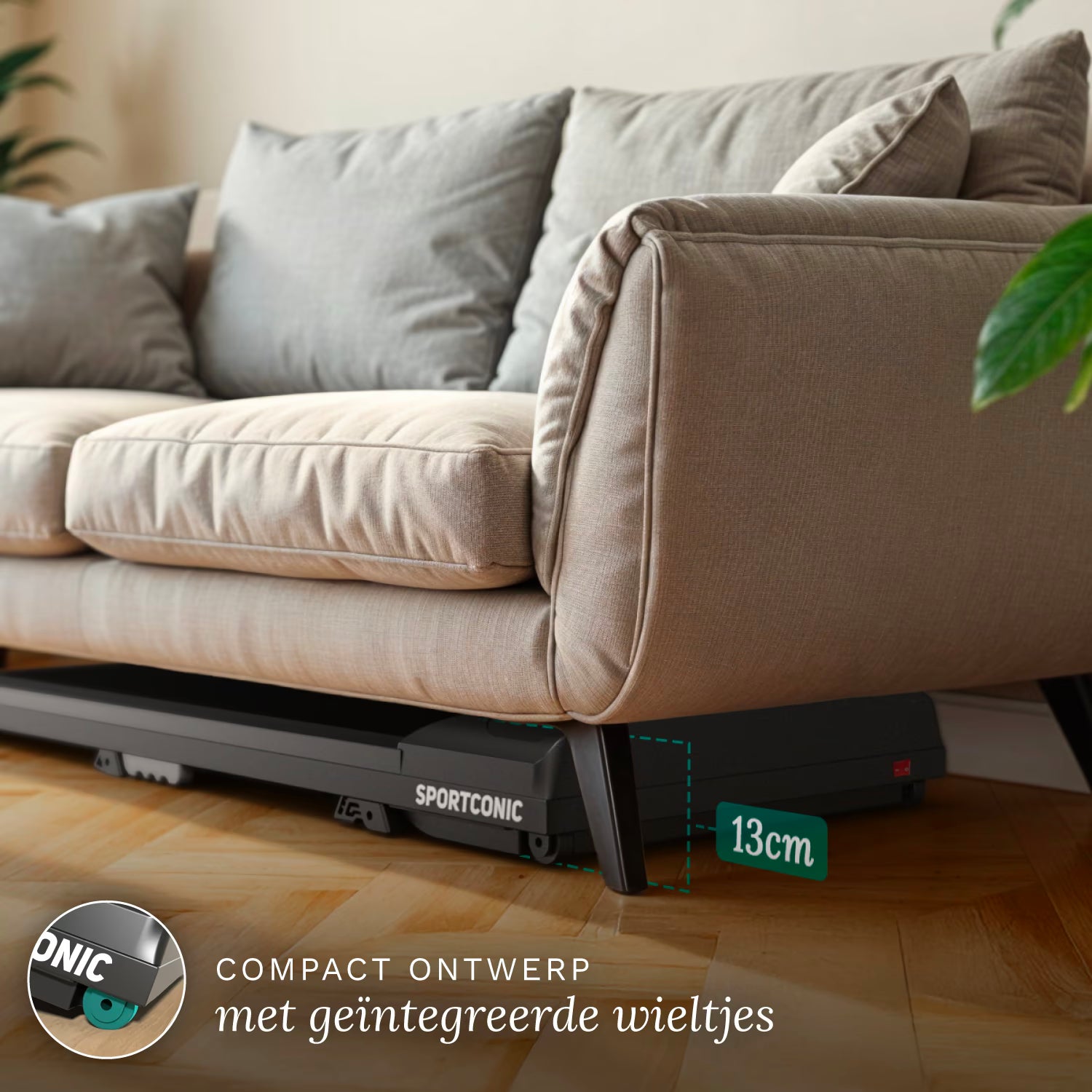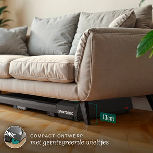 De wandelband is ideaal voor thuisgebruik dankzij het slimme en compacte ontwerp. Met een hoogte van slechts 13 centimeter schuif je hem moeiteloos onder een bank, bed of kast. De geïntegreerde wieltjes maken verplaatsen snel en moeiteloos, zelfs in kleinere woonruimtes.